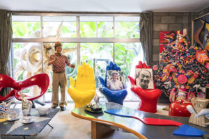 This space was used as a reception room or for discussions, its floor-length windows creating the impression of connecting with and being a part of the garden. Aside from the pink object [a “tree of life” that he brought back from Mexico] in the rear right of the room, everything else in it was designed by Taro. burying himself in silicon, he made the mannequin of himself that is in the rear left and so it is totally accurate in both size and shape. Like the studio, this room too is 100% pure Taro but in a different context.
